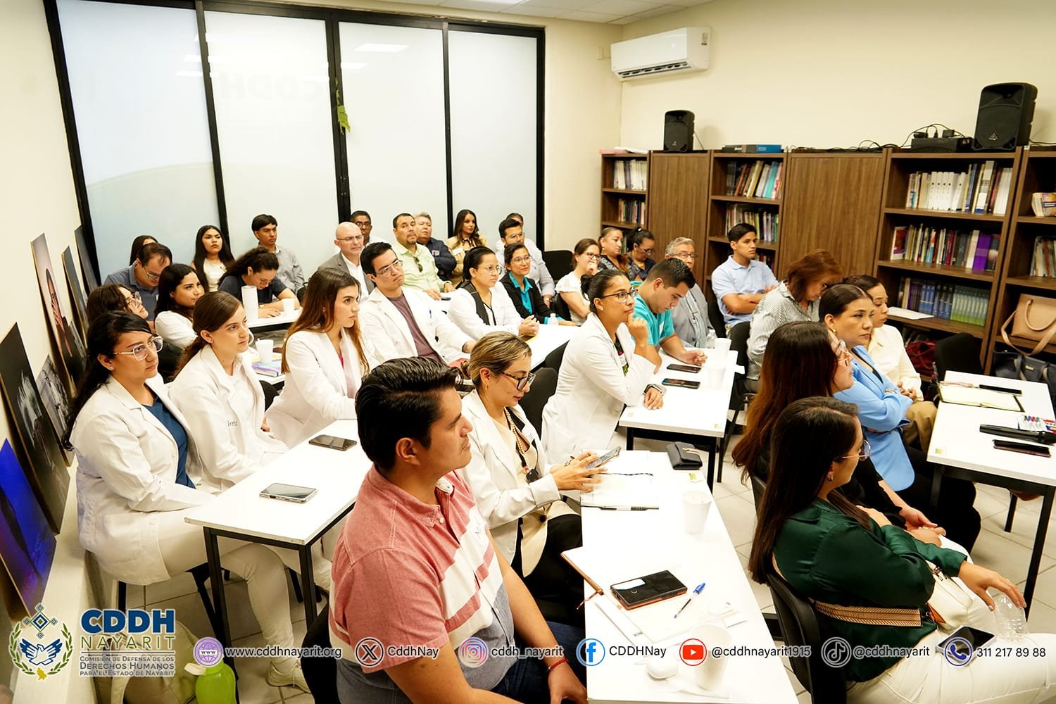 En las instalaciones de la biblioteca de la Comisiรณn de Defensa de los Derechos Humanos para el Estado de Nayarit, el ๐๐ฟ. ๐๐ฎ๐ฟ๐น๐ผ๐ ๐๐น๐ฏ๐ฒ๐ฟ๐๐ผ ๐ฃ๐ฟ๐ถ๐ฒ๐๐ผ ๐๐ผ๐ฑ๐ผ๐, presidente del organismo, ๐ฝ๐๐๐ผ ๐ฒ๐ป ๐บ๐ฎ๐ฟ๐ฐ๐ต๐ฎ ๐น๐ฎ ๐ฐ๐ฎ๐ฝ๐ฎ๐ฐ๐ถ๐๐ฎ๐ฐ๐ถรณ๐ป ๐ฒ๐ป ๐บ๐ฎ๐๐ฒ๐ฟ๐ถ๐ฎ ๐ฑ๐ฒ ๐๐ถ๐ผ๐น๐ฒ๐ป๐ฐ๐ถ๐ฎ ๐ผ๐ฏ๐๐รฉ๐๐ฟ๐ถ๐ฐ๐ฎ, dirigida para profesionales del รกrea de la salud de diferentes instituciones en el rubro.